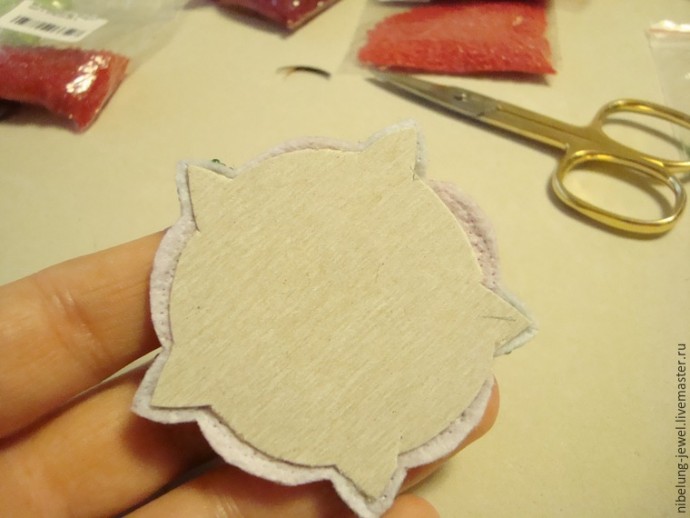 Вырезаем из картона деталь чуть меньше получившейся вышивки, для укрепления броши. Приклеиваем к изнаночной стороне картонный уплотнитель.