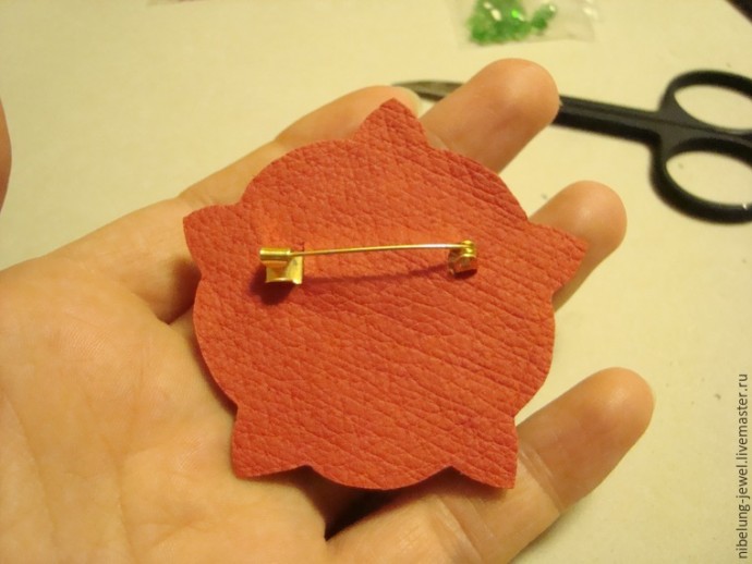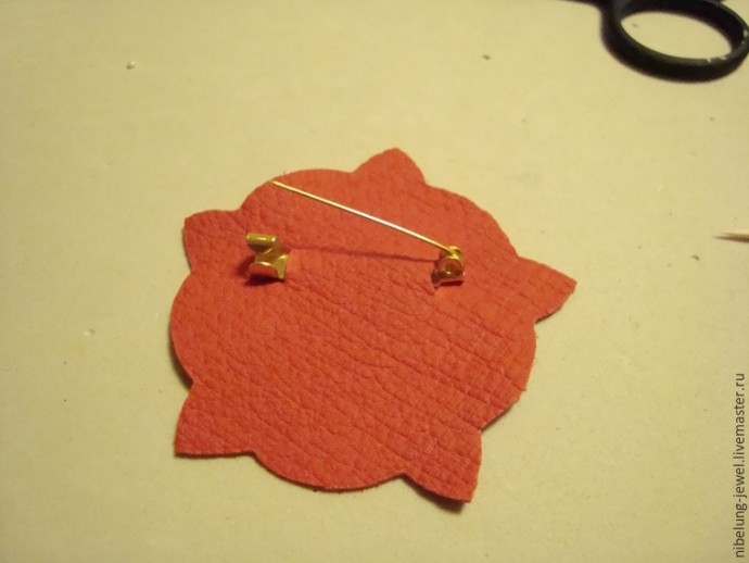 На изнанке разметить отверстия для заколки-основы, вырезать. Вставить основу в кожаную деталь и приклеить моментальным клеем (клея надо очень немного, одну капельку, просто прихватить брошку)