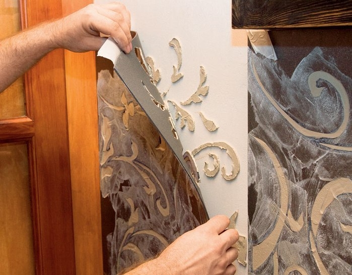 Когда гипс начнет схватываться (уже закрепится на стене, но еще не затвердеет), осторожно отклеиваем трафарет от стены.