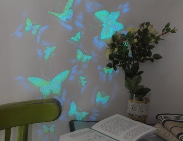 Чтобы сделать декор 'Бабочки' выберите светлую стену. Кроме того, недалеко от рисунка люминофорной краской должен находиться источник яркого света. Например, настольная лампа. Это требование связано с особенностями люминофорной краски.