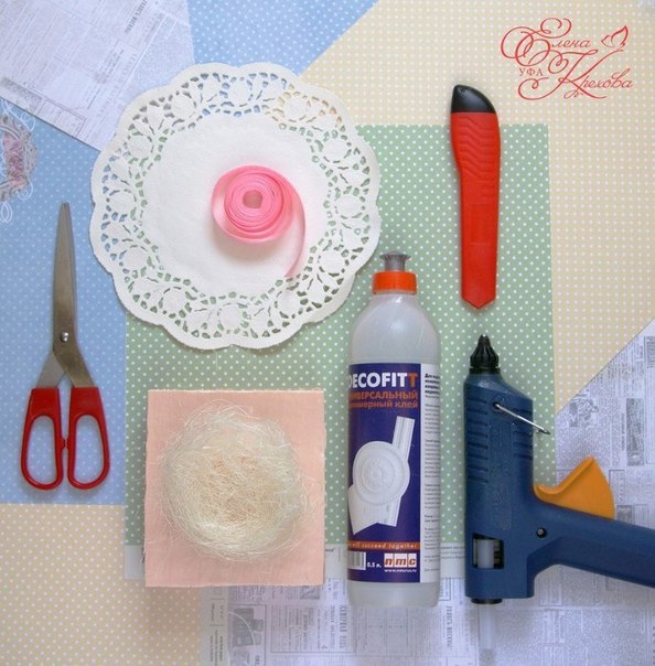 Скрап-бумага или картон, сизаль, пенополистирол (пенопласт), ножницы, декоративная салфетка, лента для декора, любой клей для пенопласта или пенополистирола, можно использовать клеевой пистолет.