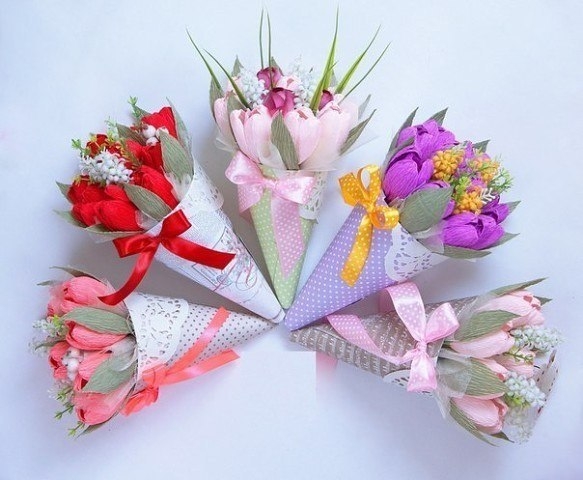 Основу для букетика нужно вклеить в кулек. Используем клей для пенопласта.
