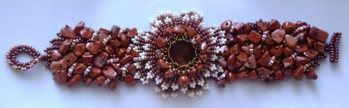Кольчужный цветок с бусинами: мастер-класс Самое трудное — это подобрать размеры колец и бусин. Бусина должна примерно на 0,5 мм. быть меньше внутреннего диаметра кольца. 1. Подготовьте 12 закрытых колец, остальные оставьте открытыми. 2. Наденьте 12 закрытых колец на 1 открытое, закройте его. 3. Соедините каждую пару колец двумя открытыми, закройте их. У Вас должно получиться 6 коротких цепочек 2-2 нанизанных на 1 кольцо. 4.Возьмите одну из цепочек и отверните в стороны верхние кольца, к...