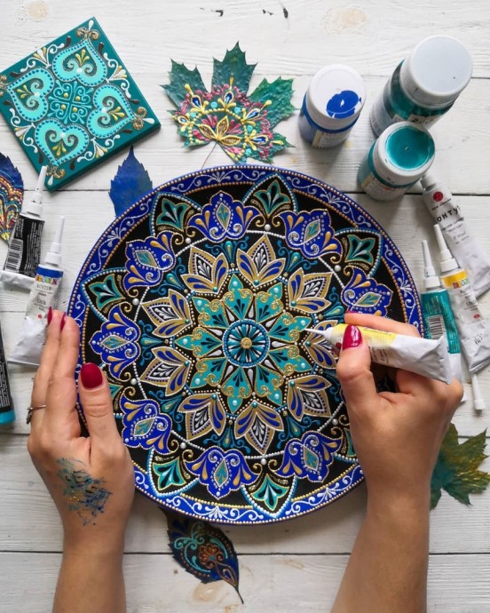 Роспись панно в технике Dot-art без использования дотсов Материалы: деревянная заготовка, шпатлевка по дереву, акриловый грунт, акриловые контуры, карандаш, циркуль, линейка, акриловые краски и лак, белый карандаш, палитра, шило, наждачная бумага, палочки для суши Процесс: Dot-art — одна из разновидностей точечной росписи, получившая в последнее время широкую популярность. Крупные, объёмные точки-горошины, сплетаясь в ажурные узоры мандал, поражают своей красотой, геометрически выверенным рисунком...