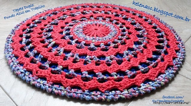 Двойной круглый коврик можно связать крючком из пряжи спагетти или из трикотажных полосок, используя