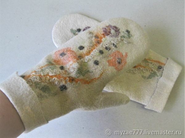 Валяние варежек Материалы: тонкая шерсть для валяния, волокна вискозы, лоскуты шелка, кружево Материалы: Тонкая шерсть для валяния 50г, волокна вискозы 15г для ламинации. В декоре используем «богатство» остатки пряжи, ниток. Главное требования к ним, чтобы были натуральные не менее, чем на 50%. Лоскуты ткани разряженного полотняного переплетения. Ажурное кружево. Инструменты: Пупырчатая пленка в размер стола, шаблон для варежек, капроновая сетка 60*60, целлофановые перчатки, пуходерка по ж...
