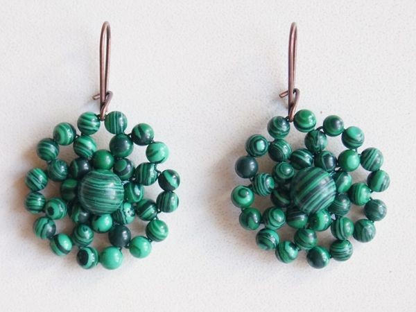 Серьги "Чертополох" Используйте «кирпичик» и «елочка», чтобы создать пару сережек с цветами, навеянными пустыней. Материалы 2 г прозрачных бисерин с бронзовым покрытием 8° (A) 1 г металлических бусин античного золота 8° (B) 2 г прозрачных аметистовых цилиндрических бисерин 8° (C) 2 г коричневых ирисовых бисерин 6° (D) 2 г черных бусин треугольников AB 3 мм с бронзовым отливом (E) 2 медных 13 мм (внешний диаметр)/8 мм (внутренний диаметр) кованых бесшовных плоских кольца 1 пара бронзовых швенз 2 см...