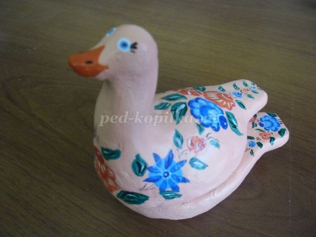 Шкатулочка из глины в виде утёнка: часть 4 Шкатулочка из глины в виде утёнка: часть 4 Автор: Алябьева Марина Викторовна. Добавляем элементы цветов синим и рубиновым цветами. Выполняем оживку белым по цветам и лепесткам. Объединяем композицию чёрной прорисовкой. Работа готова Часть 1 https://www.diyideas.ru/50964-shkatulochka-iz-gliny-v-vide-utyonka-chast-1.html Часть 2 https://www.diyideas.ru/50970-shkatulochka-iz-gliny-v-vide-utyonka-chast-2.html Часть 3 https://www.diyideas.ru/50976-shkatulochka-iz-gliny-v-vide-utyonka-chast-... Добавить в закладкиНазначить теги Ожерелье из полимерной глины: мастер-класс, часть 2 Ожерелье из полимерной глины: мастер-класс, часть 2 Автор Ольга. Лепим глазки и лапки Сажаем лягуху на листочек и долепливаем лапки Лепим камушки. Для придания текстуры камня я тоже делала слои из разных цветов глины А теперь делаем цветочки и бородавки на лягушке. Тонируем. И вот, моя лягушечка готова. Можно использовать разную фурнитуру... Шнурок, цепочку и т.д. Я сделала бисерную цепочку. Нанизала 2 расцветки бисера на проволоку (4шт) и скрутила в жгут. Я еще добавила бисерных бородавок на лягух... Добавить в закладкиНазначить теги Шкатулочка из глины в виде утёнка: часть 3 Шкатулочка из глины в виде утёнка: часть 3 Автор: Алябьева Марина Викторовна. Перед тем, как расписывать изделие, грунтуем его для крепости и яркости цвета белилами. Акриловой розовой краской покрываем изделие, внутри и после высыхания снаружи. Рисуем красные подмалёвки для Городецких цветов, добавляем голубые подмалёвки, зеленые подмалёвки - листочки. Часть 1 https://www.diyideas.ru/50964-shkatulochka-iz-gliny-v-vide-utyonka-chast-1.html Часть 2 https://www.diyideas.ru/50970-shkatulochka-iz-gli... Добавить в закладкиНазначить теги Ожерелье из полимерной глины: мастер-класс, часть 1 Ожерелье из полимерной глины: мастер-класс, часть 1 Автор Ольга. Нам понадобится полимерная глина и инструменты, для работы с полимерной глиной. Но, так - как я еще тогда не приобрела инструментов, то се делала из подручных материалов. Для начала будем делать кору дерева. Возьмем коричневую глину и раскатаем. При помощи подручных инструменто придаем имитацию коры Делаем на концах зазубрины резаком. Немного сминаем пластику. У нас должна получится вот такой кусочек коры. С помощью молда (у меня был на... Добавить в закладкиНазначить теги Шкатулочка из глины в виде утёнка: часть 2 Шкатулочка из глины в виде утёнка: часть 2 Автор: Алябьева Марина Викторовна. По шаблону будем подгонять верхнюю часть глиняного изделия. Из второго куска лепим таким же способом верхнюю часть «Утицы», добавляя шею и голову. Шея и голова лепится из дополнительного небольшого куска глины. Скатываем длинненькую морковку Примазываем к крышке толстым концом, а тонкий загибаем и формируем в виде шеи и головы. Всю поверхность с снаружи и изнутри заглаживаем влажными руками, размер подгоняем по шаблон... Добавить в закладкиНазначить теги Шкатулочка из глины в виде утёнка: часть 1 Шкатулочка из глины в виде утёнка: часть 1 Автор: Алябьева Марина Викторовна. Необходимый материал для лепки: глина, ёмкости с водой, пластиковые доски, тряпочки; для росписи: белила, акриловые краски, кисть для грунтовки – щетина, кисти нейлон для росписи № 1, 2, 3. Процесс: Большой кусок глины делим на две части. Из одной катаем толстую морковку. В широкой части, вдавливая, выполняем углубление. Узкую часть формируем в виде хвостика.Заглаживаем поверхность влажными пальцам... Добавить в закладкиНазначить те