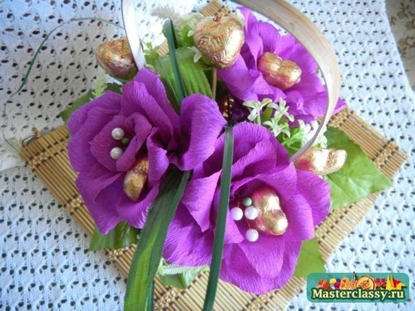 Цвeты из гофрированной бумаги и конфет: мастер-класс