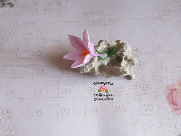 Создаем цветок из листьев: часть 4 Автор Marina marine. Листочки приклеиваем немного отступив от основания, чтобы они выглядывали из-под цветка. Ниточки клея потом легко убираются. Теперь делаем основу для крепления булавки и заколки. Берем кусочек фоамирана. Можно сделать круглой или как у меня. Делаем прорези для булавки и вставляем ее. Заколку приклеиваем, как на фото. Все готово — можно крепить к цветку. Смазываем горячим клеем, прикладываем и прижимаем хорошо. Предварительно проволоку среза...