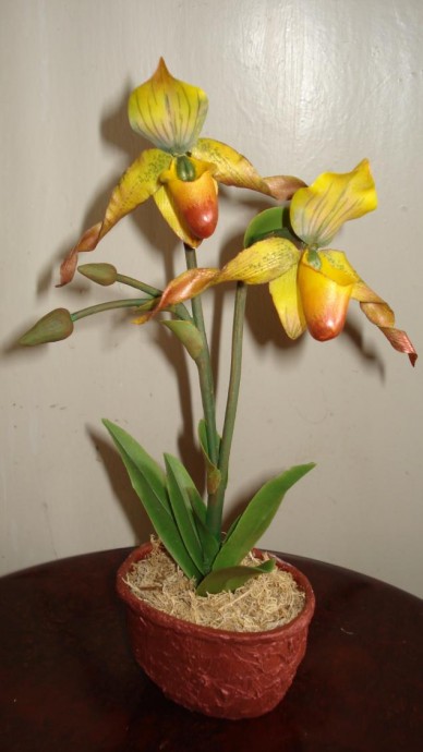 Цветок из шелка своими руками: часть 2 Автор: Бородина Оксана Викторовна. Ткань нужно сложить в 4-6 слоёв, приложить шаблон и обвести его выжигателем. Посередине круглой основы делаем выжигателем два прореза. Теперь с помощью выжигателя на основу крепим зелёные листья. По краям основы крепим первый ряд волнистых лепестков. Далее крепим второй ряд лепестков другого цвета. Лепестки крепим до тех пор, пока не буде заполнена середина цветка. Середину можно украсить бусинкой. Цветок может быть и вот...