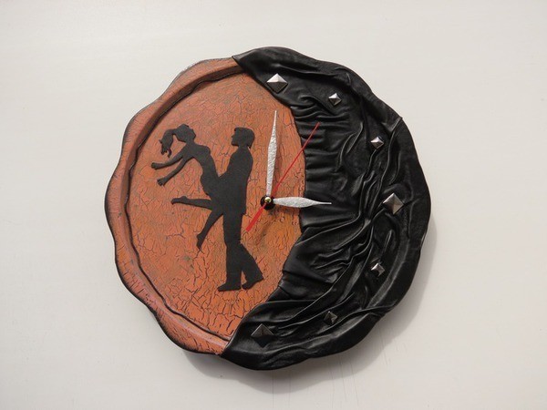 Создание "кожаных" настенных часов: часть 1 Автор Инесса. Покрываем грунтом лицевую сторону заготовки, сначала наносим кистью, затем «зачпокиваем» до идеально возможной ровности грунт (если заготовка была не очень ровная, до грунтования — пошкурить шкуркой на 800-1500). Сушим, ждём. Ищем и даже находим в интернете подходящую для декора фигурку силуэта влюбленных. У меня была использована работа «Ольга Савинова. Фотобанк Лори». Распечатываем на принтере рисунок нужных размеров, вырезаем силуэты, пр...