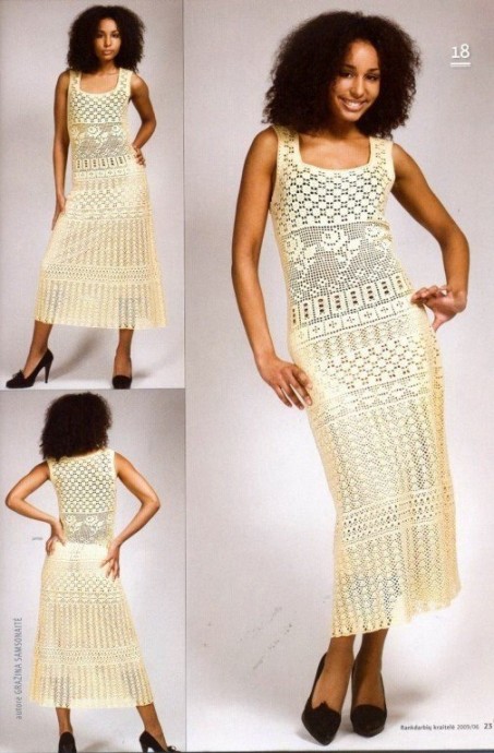 Бежевое приталенное платье Вязаное платье — украшение любого летнего гардероба. Благодаря разнообразным ажурным узорам и соблазнительному силуэту данная модель излучает женственное обаяние и представляет фигуру в лучшем виде. Размеры: 38/40 (46/48)Вам потребуется: пряжа (80% вискозы, 20% льна; 120 м/50 г) — 700 (800) г бежевой; спицы № 3,5; крючок № 3. Узор 1: ажурный узор из ромбов (число петель кратно 18 + 1+2 кромочные) = вязать согласно схеме 1. На ней даны лицевые ряды. В изнаночных р...