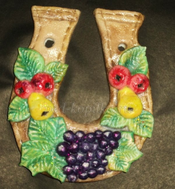 Подкова на стену: мастер-класс в технике wire wrap, часть 2 Подкова на стену: мастер-класс в технике wire wrap, часть 2 Автор Лена Серёжкина Теперь берем среднюю проволоку и начинаем сгибать надпись "на счастье". Это у меня так, но вы конечно же можете сделать любую другую или вообще заполнить всю подкову произвольными узорами. Несколько правил сгибания текста: прежде чем гнуть текст, надо четко понять его высоту и примерную длину (лучше написать и гнуть по эскизу), которые зависят от того места, куда вы его вписываете — у нас от ширины подковы. ... Добавить в закладкиНазначить теги Подкова на стену: мастер-класс в технике wire wrap, часть 1 Подкова на стену: мастер-класс в технике wire wrap, часть 1 Автор Лена Серёжкина Нам понадобятся: медная проволока — толстая 1,2-1,5 мм для основы (60 - 70 см длиной); медная проволока — средняя 0,8-1,1 мм для узоров и надписи (1 - 1,5 м длиной); медная проволока — тонкая 0,4мм для оплетения (1,5 - 2 м длиной); инструмент: круглогубцы, бокорезы, длинногубцы (гладкие пассатижи); молоток и наковальня. Можно нарисовать эскиз будущей подковы и работать по н... Добавить в закладкиНазначить теги Подкова из соленого теста своими руками: часть 2 Подкова из соленого теста своими руками: часть 2 Автор: Попова Екатерина Рафаиловна. 10. Отправляем изделие на просушку (можно поставить под батарею, т.к. в духовке изделие часто растрескивается). Подкову можно оформить и так Через пару дней аккуратно поддев ножом (как бы подрезая), перевернуть и высушить с другой стороны. Подкова толстая и сушится под батареей дней 5. 11. Высохшее изделие раскрашиваем. 12. Покрываем акриловым лаком – аккуратно, мягкой широкой кистью, что... Добавить в закладкиНазначить теги Подкова из соленого теста своими руками: часть 1 Подкова из соленого теста своими руками: часть 1 Автор: Попова Екатерина Рафаиловна. Рецепт теста 1 часть муки,1 часть соли (соль обязательно мелкая), клей ПВА – 1-1,5 столовые ложки, вода. Замешиваем крутое тесто, так чтобы не липло к рукам, но сохраняло пластичность (не трескалось). Материал для изготовления подковы Шаблон подковы из картона, дощечка для раскатывания теста, скалка, стека, нож, стакан с водой, кисточка мягкая. Для оформления Краски гуашевые и акварельные, кисточки – тонкая, ... Добавить в закладкиНазначить теги Подкова из кофейных зерен своими руками: часть 3 Подкова из кофейных зерен своими руками: часть 3 Автор: Столь Оксана Владимировна. Как только ткань высохла рисуем дубовый листок и вырезаем. Затем приклеиваем(клей «Титан») на листочке прожилки из шпагата Связываем наши желуди. Дубовый лист высох и стал очень жестким(я вынула проволоку, она мне не понадобилась) Оформляем наши подковы. Приклеиваем магниты на подкову Для подковы с желудями с изнаночной стороны приклеила веревочку из шпагата. Часть 1 https://www.diyideas.ru/50604-podkova-iz-kofe... Добавить в закладкиНазначить теги Подкова из кофейных зерен своими руками: часть 2 Подкова из кофейных зерен своими руками: часть 2 Автор: Столь Оксана Владимировна. Изготовление бантиков для украшения: Делаем все бантики из четырех «лепестков», немного прихватить нитками (сделала из тонкой тесьмы - красный и коричневый бант) Этот бантик в горошек сделан также, как и красный Сшиваем три бантика вместе и в серединку приклеиваем бусинку или кофейные зерна Изготовление желудей из кофейных зерен: Проколоть шилом капсулу от бахил и 