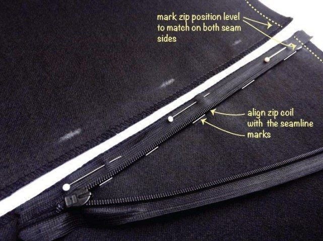 Как вшить потайную молнию Приколите булавками тесьму молнии к припускам швов изделия, выравнивая края (при этом само изделие ниже застежки молнии не сшито) Приметайте молнию крупными стежками и пристрочите на швейной машине с помощю лапки для молнии одну сторону Отметьте место на другой стороне молнии, где закончили шов Приколите, выравнивая, булавками вторую половину молнии Пристрочите точно до метки Стачайте шов ниже молнии, начиная от меток Прикрепите свободные концы молнии к припускам шв...