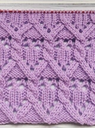Волнистый узор спицами со схемой 1-й ряд: 1 изн., 1 лиц., накид, 4 п. пл.гл., 2 п.вм.лиц., 5 лиц., 1 изн. 3-й ряд: 1 изн., 2 лиц., накид, 4 п. пл.гл., 2 п.вм.лиц., 4 лиц., 1 изн. 5-й ряд: 1 изн., 3 лиц., накид, 4 п. пл.гл., 2 п.вм.лиц., 3 лиц., 1 изн. 7-й ряд: 1 изн., 4 лиц., накид, 4 п. пл.гл., 2 п.вм.лиц., 2 лиц., 1 изн. 9-й ряд: 1 изн., 5 лиц., накид, 4 п. пл.гл., 2 п.вм.лиц., 1 лиц., 1 изн. 11-й ряд: 1 изн., 5 лиц., 2 п.вм.лиц., 4 п.пл.гл., на...