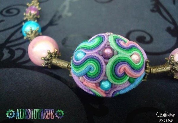 Сутажная бусина: мастер-класс Сутаж – это тонкий, плоский и гибкий тканевый шнур, лента или жгут, чаще всего, шелковый. Сутажные украшения – это изделия, в основе которых лежит сутажный шнур. Эта техника заключается в обшивании кабошонов из драгоценных и полудрагоценных камней сутажной тесьмой, при этом вшивая между лентами бисер, дополняя некоторой фурнитурой.