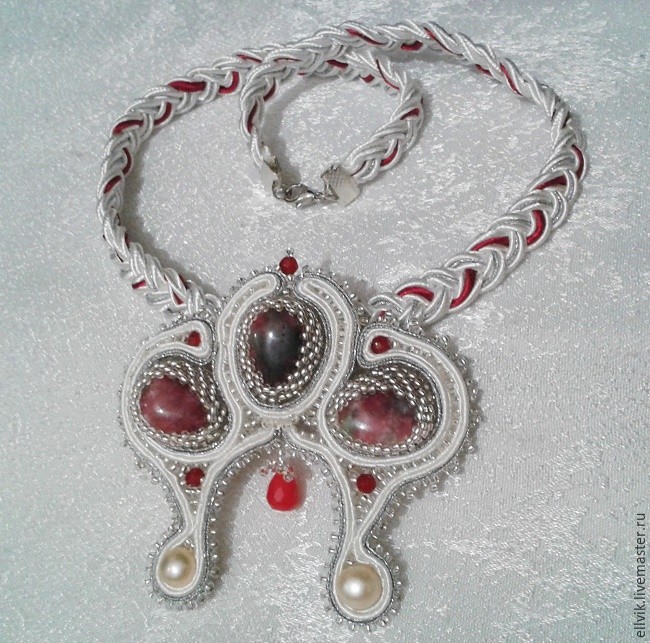 Подковка на счастье К созданию украшения подтолкнула неделя, посвященная лошадям. Для создания украшения нам понадобится: 1. Три кабашона (у меня бусины турмалина размером 1,8 х 2 см). 2. Сутаж двух видов: белый, брусничный — шелковый и серебристый — метализарованный (по 60 см). 3. Бусины турмалина огранки рондель 3 х 5 мм. 4. Две крупных кремовых жемчужины. 5. Капля огненного халцедона 5 х 8 мм. 6. Серебристый бисер PRECIOSA ORNELA № 10. 7. Мононить и бисерная игла. 8. Ножницы....