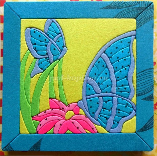 Картина в технике кинусайга "Бабочка и цветы": часть 3 Автор: Шабанова Марина Геннадьевна. Продолжаем работу по этому же принципу. Внутренняя часть крылышек готова. Внешнюю часть крылышек выполнила из однотонной ткани. Можно изменить порядок заполнения деталей. Вторую бабочку начала делать со внешнего контура. Затем заполнила внутреннюю часть. Заполняем фон. Подбираем подходящую ткань. Вправляем в прорези с небольшим натяжением во избежании складок. Фон заполнен. И крупные, и мелкие фрагменты....