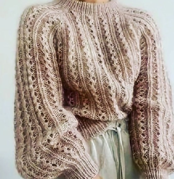 Женственный двухцветный джемпер Благородное сочетание оттенков воплотилось в изысканном джемпере с кокеткой в полоску и традиционным узором из розочек.Размеры 36/38 (40/42) 44/46 Потребуется Пряжа (41% мохера, 37% шерсти, 20% шелка, 2% полиэстера; 145 м/25 г) — 150 (175) 200 г серо-коричневой и 50 (75) 75 г цв. мальвы; спицы №3; круговые спицы №3. Ажурный узор В круговых рядах число петель кратно 6. Вязать согл. схеме. На ней даны нечетные круговые ряды. В четных круговых рядах петли провя...