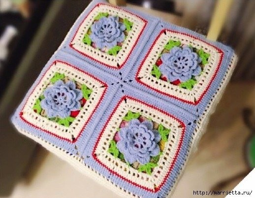Бабушкин квадрат с цветком по центру Можно связать сумочки или наволочки. Шаль будет очень уютной и теплой.